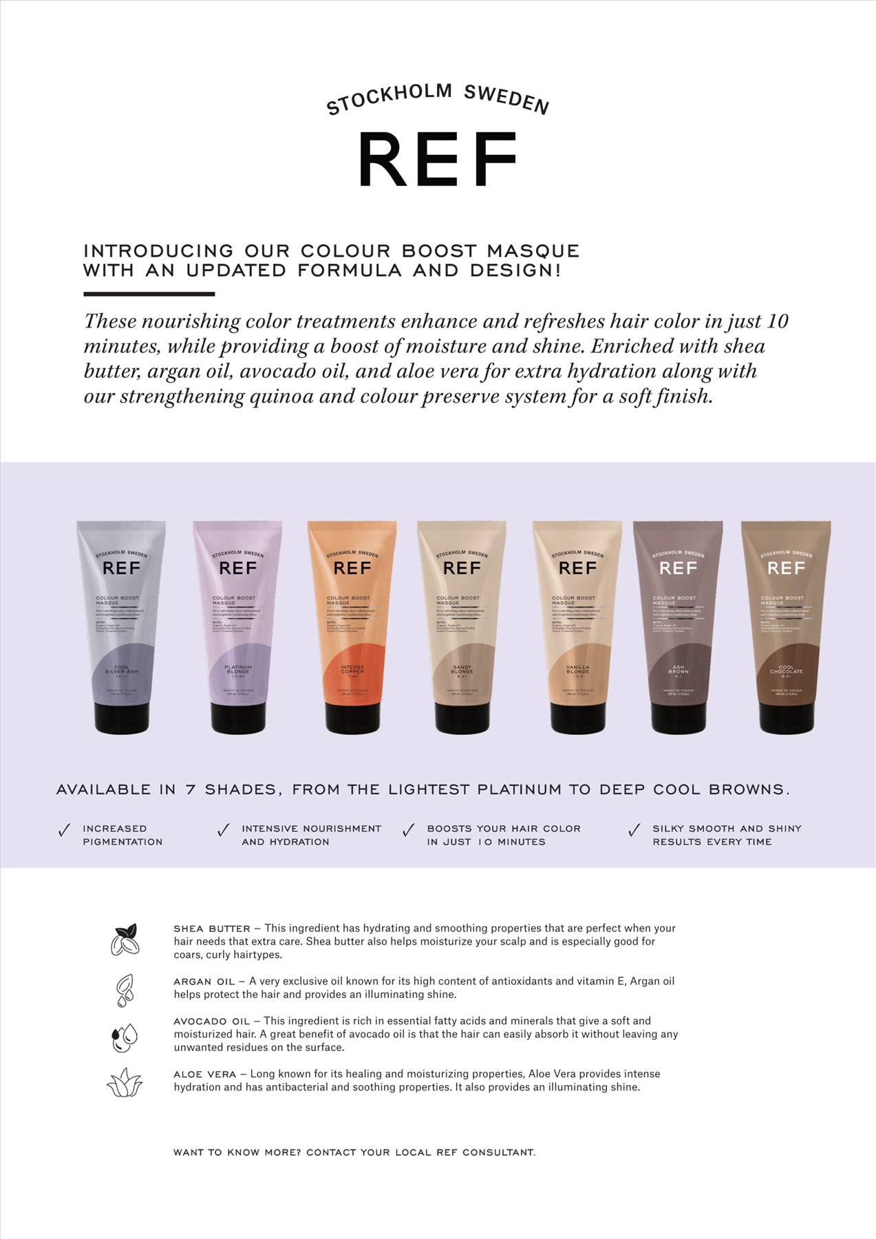 REF Stockholm Colour Boost Masque enhances and refreshes hair colour in just 10 minutes, delivering intense moisture and radiant shine. Enriched with Shea Butter, Argan Oil, Avocado Oil, Aloe Vera, Strengthening Quinoa Protein, and REF Colour Preserve System, this vegan formula hydrates and softens for a silky finish. Ideal for all hair types, apply to clean, towel-dried hair, leave for 10 minutes, then rinse. Available in a 200ml (6.76 fl. oz) tube.